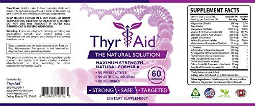- Feature : THYRAID - THYRAID Is The #1 Choice for Thyroid Health. ThyrAid was formulated to provide full thyroid care, adrenal and pituitary gland support, immune system boost, fight oxidative stress and hormonal balance. Whether your thyroid problem is genetic, or due to imbalanced hormone levels or a lack of vital nutrients, ThyrAidTM can help get you the results you are looking for. / THYRAID: The Most Effective Thyroid Supplement Available - ThyrAid stands above other products on the market, effectively relieving the problem from the inside out. ThyrAid provides a maximum strength solution, attacking the core of the problem from multiple angles. When a capsule is taken, the powerful ingredients travel through your blood to maintain optimal vitamin, mineral and nutrient levels without any unwanted side effects. / HIGH QUALITY INGREDIENTS - Every single ingredient in ThyrAid was hand-picked by a team of medical doctors and scientific researchers, based on clinical data and designed to promote ultimate thyroid health and get results more effectively than any other thyroid supplement available. / ThryAid is produced in the United States in a FDA registered laboratory that exceeds industry standards. Our manufacturing facility is GMP certified and abides by the highest FDA guidelines. / TRY RISK FREE - You have a 60 day no risk trial to try ThryAid. If you are not 100% satisfied with our product, you may receive a refund, excluding shipping charges.