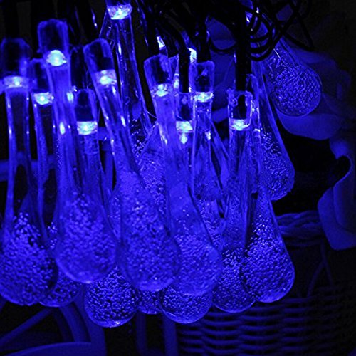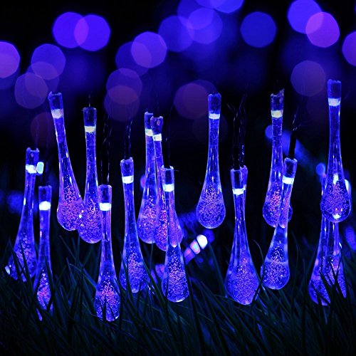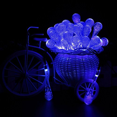 - Solar powered 4.5 meters water drop modeling fairy lights string for gardens, patio, lawn, yard, porch, camper and all indoor and outdoor activities; The whole light is waterproof,no worry for rain drops.