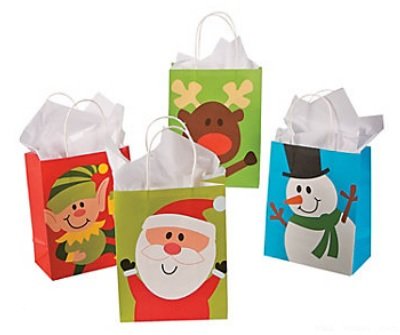 Studio : Fun Express Publisher : Fun Express Binding : Health and Beauty Product Description With this purchase you will receive 24 assorted color and style paper gift bags. Measurements are 7" x 4" x 9" with 4" handles, and come in the following assortment; 6 Red Elf - 6 Green Reindeer - 6 Blue Snowman - 6 Green Santa 0