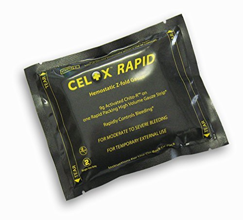 Studio : Combat Medical Systems Publisher : Combat Medical Systems Binding : Health and Beauty Product Description NSN 6510-01-623-9903 CeloxTM Rapid gauze stops severe arterial bleeding with only one minute of compression applied. This saves valuable time in an emergency as well as reducing blood loss. Independent in vivo testing showed 100 % success in achieving hemostasis and reduced blood loss compared to other treatments. CeloxTM Rapid forms an adhesive gel that seals the wound. The product has also been tested in a model of casualty evacuation, achieving 100 % successful transport without re-bleeding. CeloxTM Rapid is provided in a compact z-folded format making it easy to use and carry. Dimensions: One Gauze Strip: 3\" x 5' (7.6cm x 1.5M) Dimensions: 4.25\" H x 5.25\" W x .5\" D (packaged) Weight: 1.1 oz 0