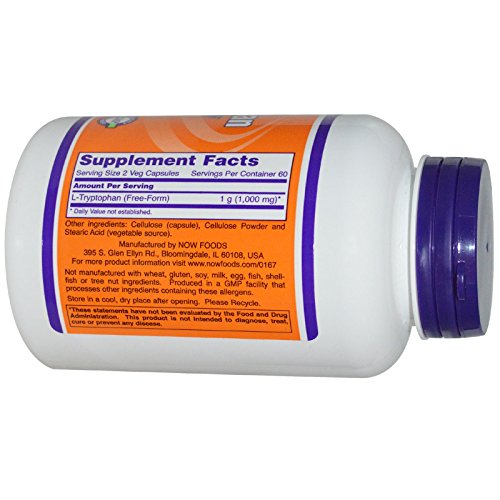 -. Binding : Health and Beauty -. Brand : NOW Foods -. EAN : 0733739001672 -. Feature : 120 VegiCaps / Serving Size: 2 Vegicaps / 60 Servings Per Container / Suitable for Vegetarians -. IsAdultProduct : 0 -. Label : NOW Foods -. LegalDisclaimer : PLEASE NOTE: Product image is representative of the product offered but may not have the exact attributes. Please read product description for the specific attributes of this product. The information above is intended for reference only. While we attempt to keep our information accurate, we cannot guarantee it is an accurate representation of the latest formulation of the product. If you have any concerns, please visit the vendor's web site. The information above are the views of the product's manufacturer, not the views of Nutrition Supply Company. -. Manufacturer : NOW Foods -. MPN : 3000167X2 -. PackageQuantity : 2 -. PartNumber : 3000167X2 -. ProductGroup : Health and Beauty -. ProductTypeName : HEALTH_PERSONAL_CARE -. Publisher : NOW Foods -. Studio : NOW Foods -. Title : L-Tryptophan 500mg 120 VegiCaps (Pack of 2) -. UPC : 733739001672
