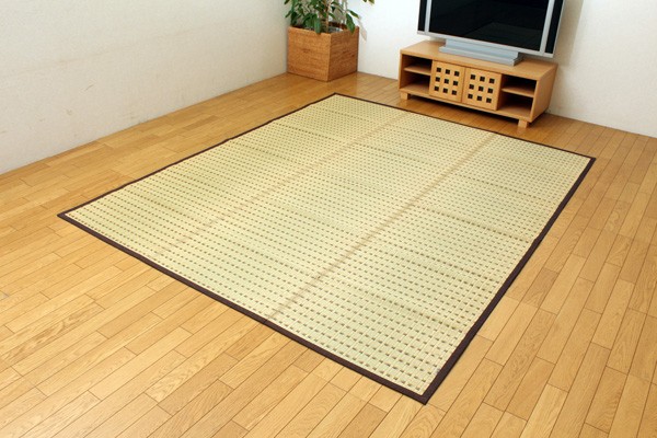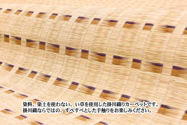 染料、染土を使わない国産(九州産)のしなやかなイ草使用し、スベスベとした気持のよい肌触りに仕上げました。掛川織は九州筑後地方の伝統的な織り方です。大きな目と小さな目に交互に織り込んだ美しく洗練されたモダンなデザインが人気です。また、厳選された良質の太く長いイ草を高密度に織り込んでいますので丈夫で耐久性があり、しかも素足に心地よいクッション性とボリューム感があります。国産(九州産)のい草を使用しています。一本一本が太く、表皮が厚く繊維がキメ細かいので弾力性があり、耐久性に優れています。い草には空気の自然浄化作用、湿度の調節作用などがあります。また汚れにくく、使用するうちに黄金色に変化し味が出ます。い草に青森ヒバ加工を施しています。(抗菌、防臭効果)通常のイ草カーペットよりも小さく折り畳むことが出来るコンパクト収納タイプです。