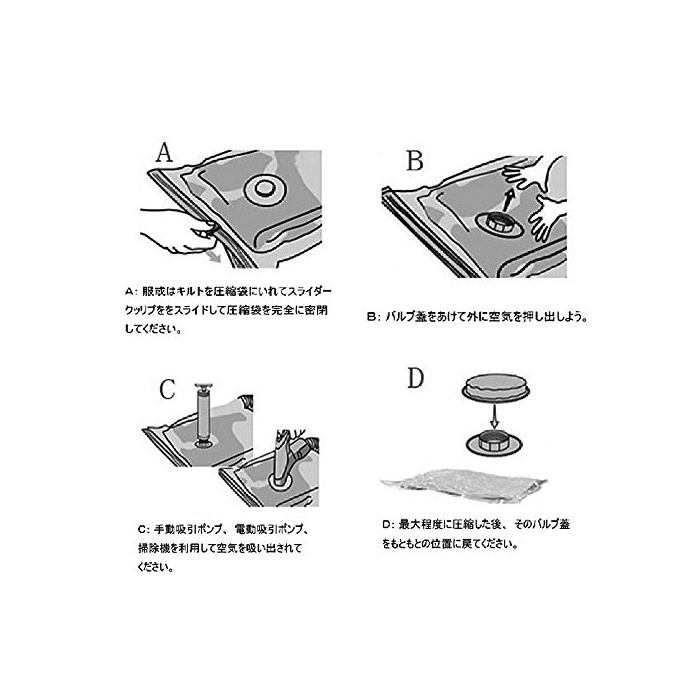 사용 방법:이불 등을 만들어 넣음(담는 그릇·상자 등) 지퍼를 닫아 하고, 밸브의 뚜껑을 제외하고,펌프를 구멍으로 나사 이라고 세트 해 하늘 긴장을 있는다,하늘 긴장을 때까지 상당한 횟수가 필요합니다.자동 록식 밸브이기 때문에,공기가 역류해 부풀어 오르는 일이 걱정 하지 마십시오.(주의:밸브의 뒤에 핑크 컬러의 실리콘이 어느(있는),하늘 긴장을 때 공기의 누락을 방지하기 위해 제치지 말아 주십시오)
