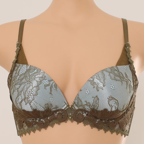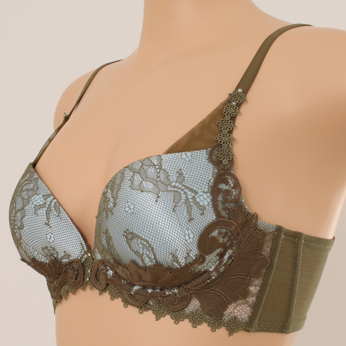 올오버 레이스와 원단 자수 모티브를 매칭하여 럭셔리 한 감각을 강조한 저중심 몰드브라입니다.