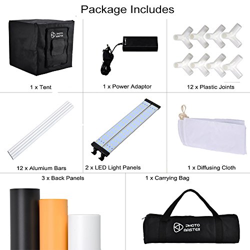 Package: 1 x light tent(16"x16"x16") 2x Square Perfect 5500K LED Light Bars 9 x Three-way valves 12 x Iron Stands 3 x PVC Backgrounds(Balck/White/Orange) 1 x Fabric Llight Diffuser/Softbox Background 1 x Power Cable 1 x Carry Bag 0