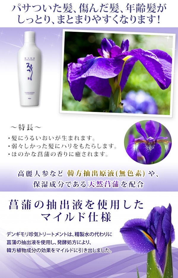 「髪がパサパサする」、「手触りが悪い」・・・などが気になる方におすすめです。天然菖蒲水に含まれる保湿成分の働きで、しっとりサラサラで健康な髪にしてくれます。 |