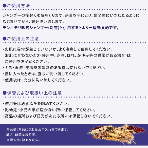 | 成分 | 水、セテアリルアルコール、シクロペンタシロキサン、ジメチコン、ステアラミドプロピルジメチルアミン、香料、シマカンギク花エキス、炭酸ジカプリリル、ベタイン、グルタミン酸、フェノキシエタノール、ジオウ根エキス、アミノプロピルジメチコン、コノテガシワ葉エキス、オウシュウヨモギエキス、アモジメチコン、セテアレス-20、グレジトシアジャポニカ果実エキス、マグワ根皮エキス、タカサブロウエキス、加水分解ケラチン、ショウブ根茎水、乳酸桿菌/ツボクサ/グレジトシアシネンシスとげ/ドクダミエキス/キハダ樹皮/イタドリ根/ウツボグサ/トリリスジャポニカエキス発酵液、スベリヒユエキス、ラウレス-23(C12-15)パレス-3、センキュウエキス、グリセリン、PEG-10、フェニルトリメチコン、セトリモニウムクロリド、トリデセス-12、パンテノール、トリ(カプリル酸/カプリン酸)グリセリル、レシチン、酢酸トコフェロール、メチルパラベン、メチルクロロイソチアゾリノン、メチルイソチアゾリノン、セラミド3 |