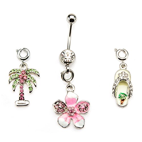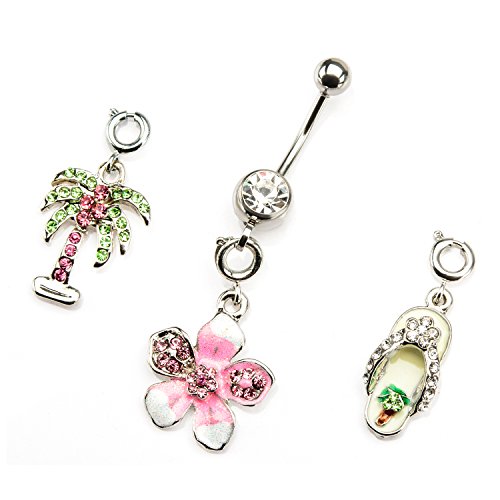 Product Description A multi gem dangling Palm Tree, Flower and Slipper shaped belly ring is a cute girly accessory for any time of the year especially for summer. These belly rings display the universal sign of summer which always creates a stunning statement. 0