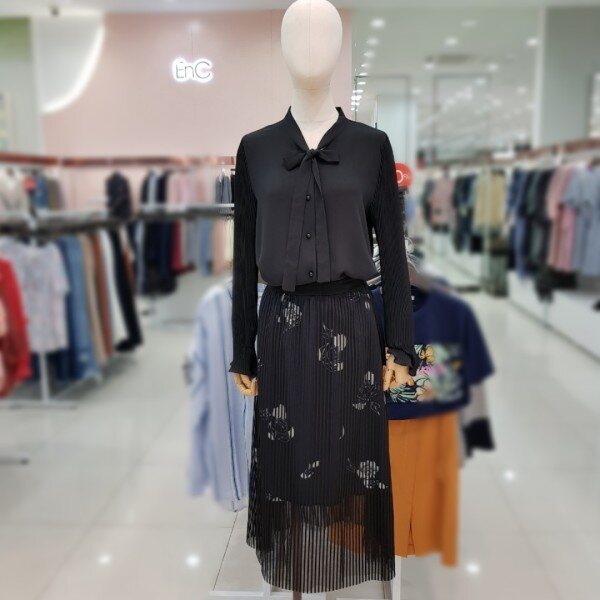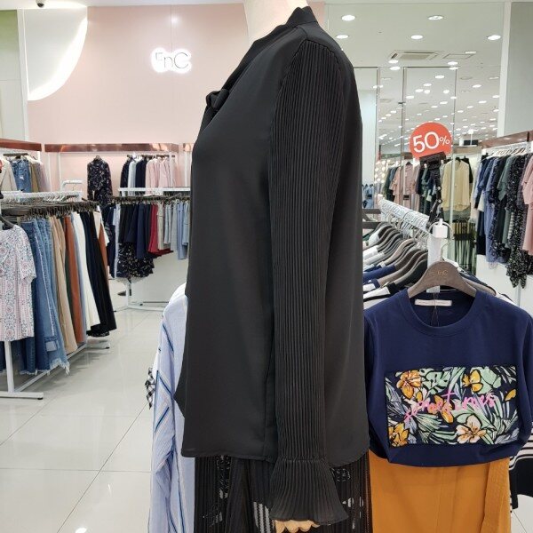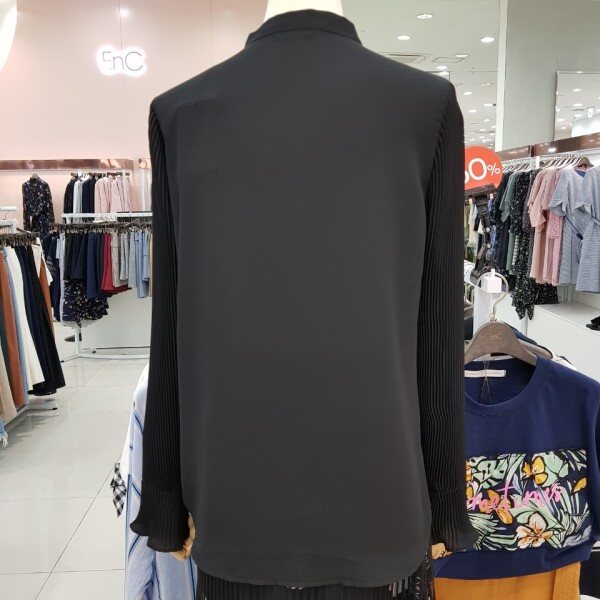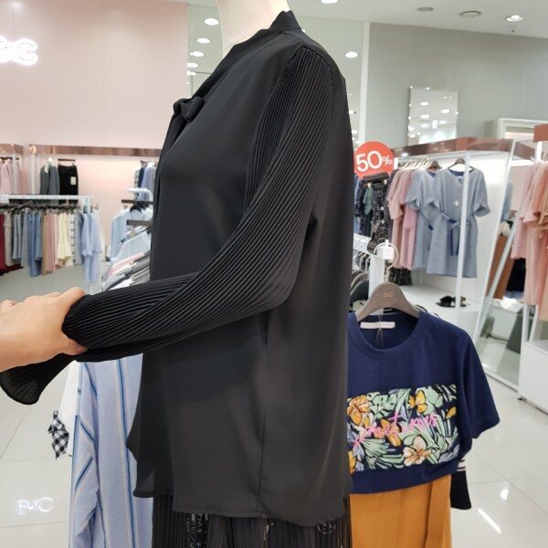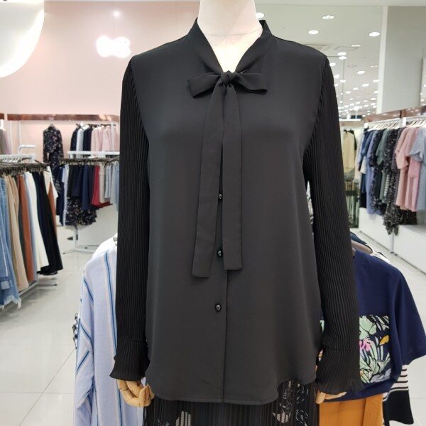 시원한 소재감으로 한여름까지 입으실수 있으며 여성스러운 플리츠 소매와 진주단추 목선의 리본이 포인트가되어밋밋할수 있는 색감에 디자인으로 우아한 분위기를 연출할수 있습니다