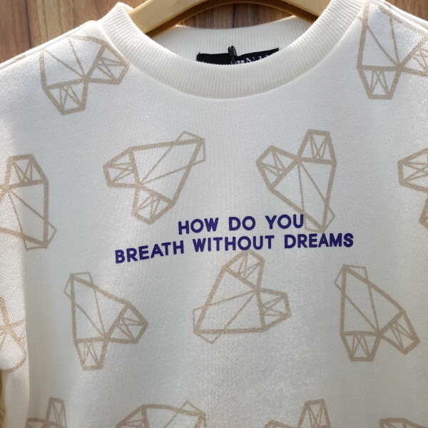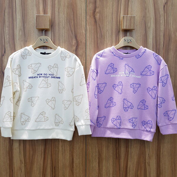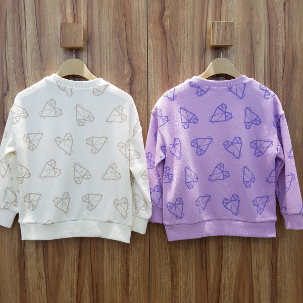 여아 전용의 오버핏 사이즈 맨투맨 티셔츠는 아이보리 칼라와 라벤더 컬러 두가지로 전체 변형 하트 그래픽 나염이 있는 아이템입니다.