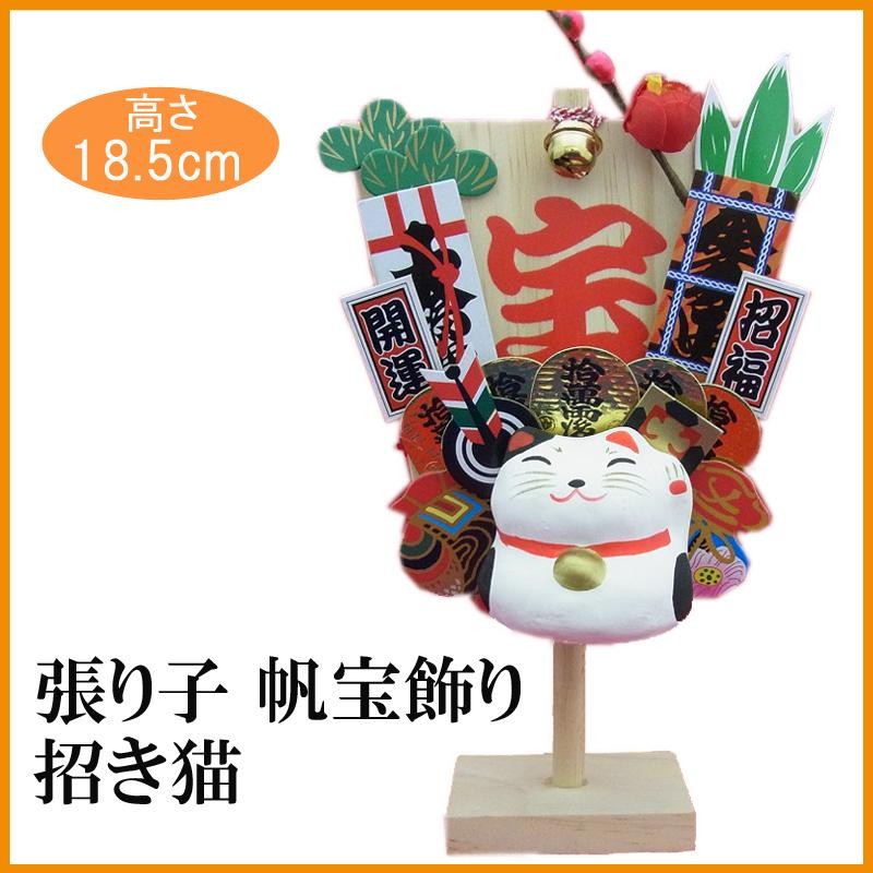 船の帆の形をした木の土台に、賑やかな飾りと招き猫を配したインテリアです。小判、宝袋、小槌、お札など豪華に飾り付けられています。招き猫は紙で作った張り子人形で、手描きで絵付けしています。 |