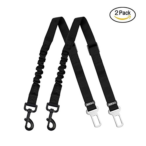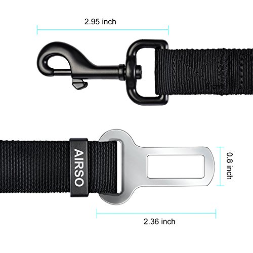 AIRSO Dog Car Seat Belts Specifications: Package Contents: 2 x Pet Seatbelt Adjustable Size: 6.29-10.62 inches (61-90cm) Width: 0.98 inches (2.5cm) Belt Tab Width: 2cm Weight: 3.2 oz / 92g Color: Black 0