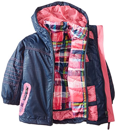 Plaid jacket features chevron quilting, zip front, and standing collar