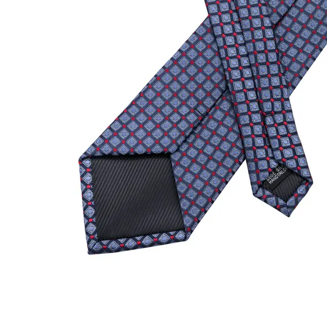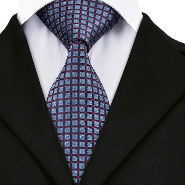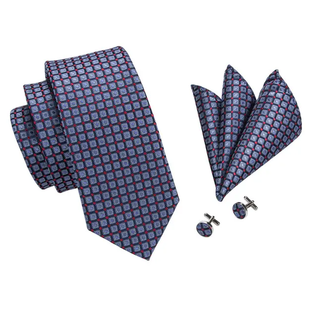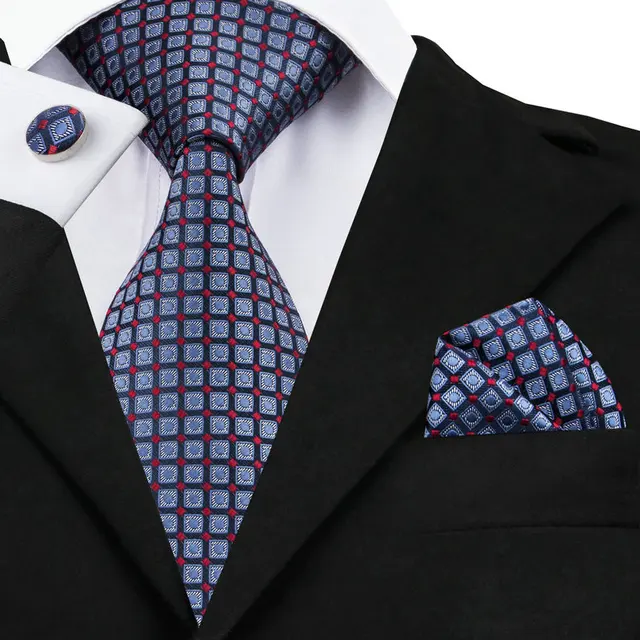 상품 내용 SN-958 블루 격자 무늬 넥타이 손수건 커프스 세트 남성 100% 실크 넥타이 남성 정장 웨딩 파티 신랑