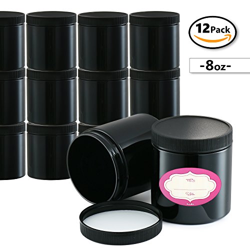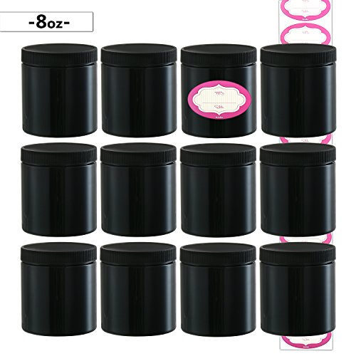 Pack of 12 - 8 Ounce All-Purpose Black Jars with Lids & Labels, Refillable BPA-Free Plastic Pots - Large Empty Round Cosmetic Containers for Body Butter,...