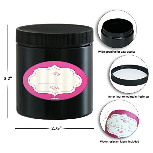- 12-PACK 8 OZ EMPTY CONTAINERS, CAPS & LABELS: Neatly organize and display your beauty products and more in these durable luxury jars with the chic labels included. Airtight screw-on lids keep contents fresh for longer than most.