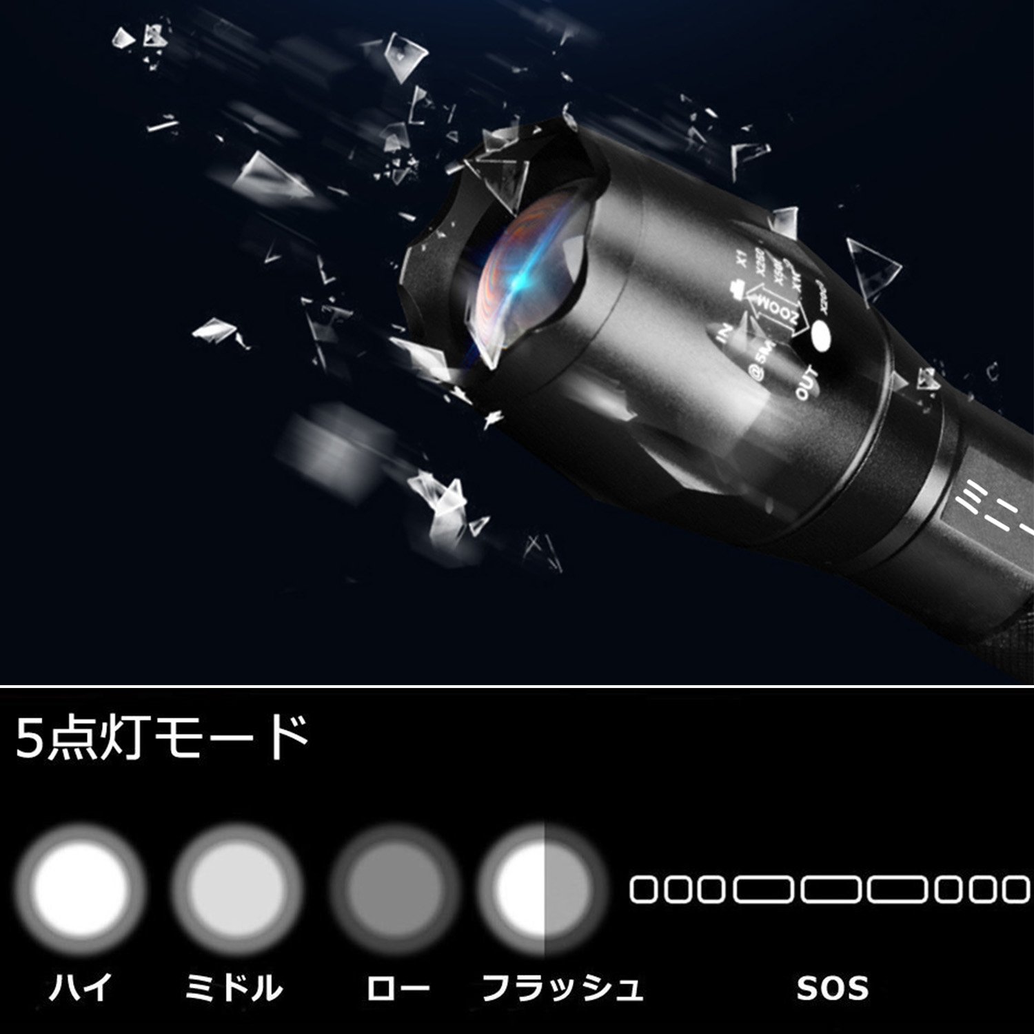Five adjustable brightness: high / middle / low / flash / SOS;