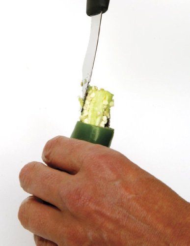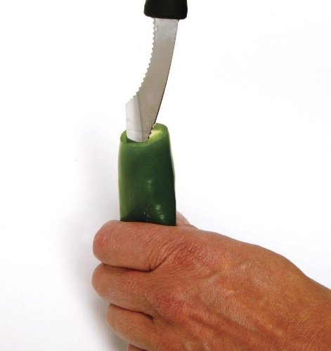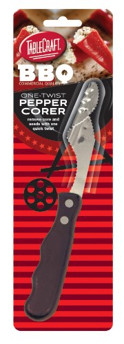 Studio : Tablecraft Publisher : Tablecraft Product Description The serrated edge and sharp inner teeth easily removes core and seeds from peppers. Features a stainless steel blade with an ergonomically shaped plastic handle. Measures 7.5" long. Great for small to medium size peppers. Perfect for prepping peppers for stuffing or making Jalapeno poppers. Dishwasher safe 0