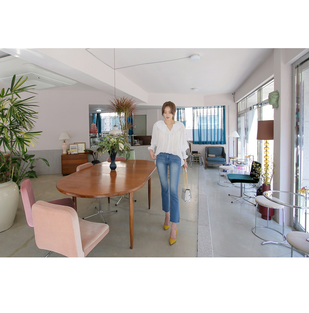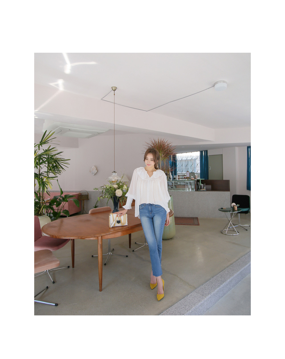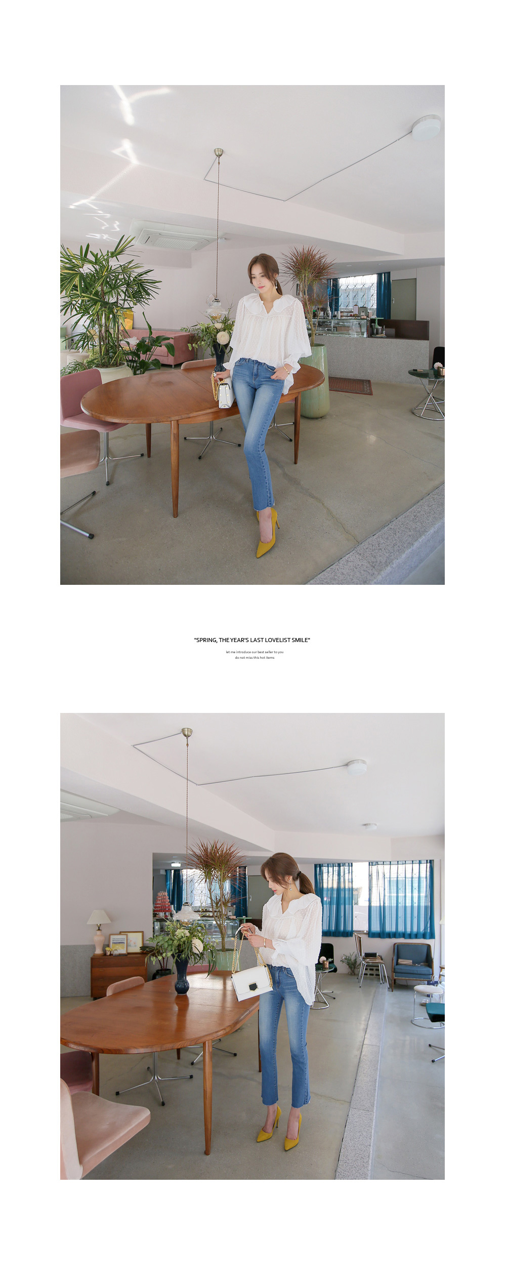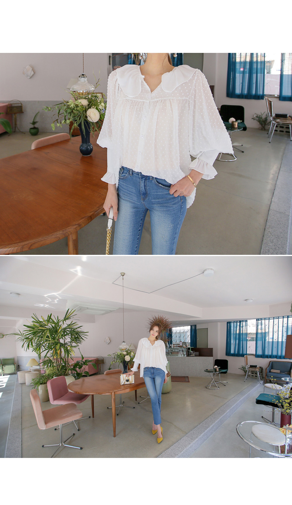 블라우스는 프릴 카라 디자인으로 여성스러운 무드를 더했으며