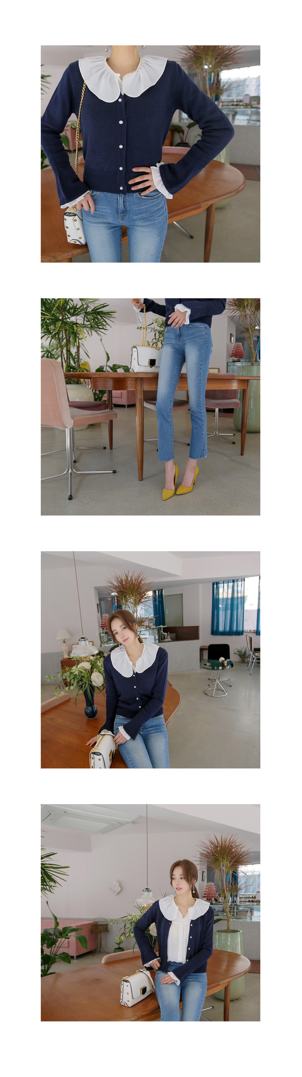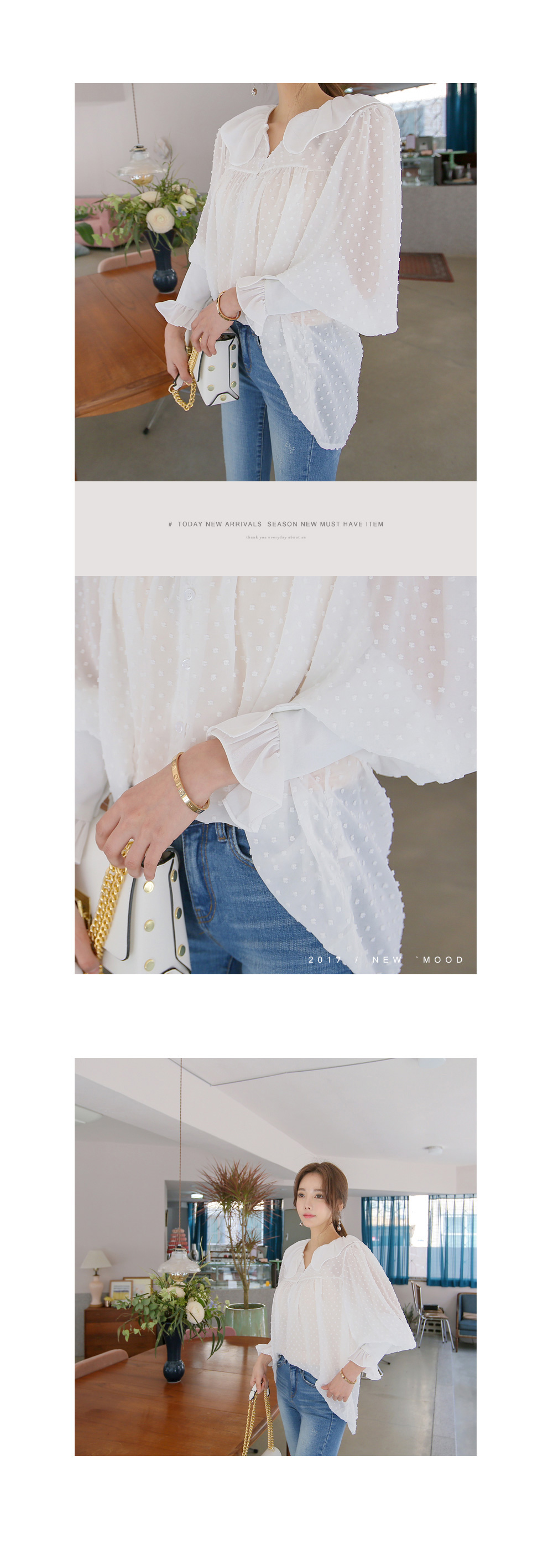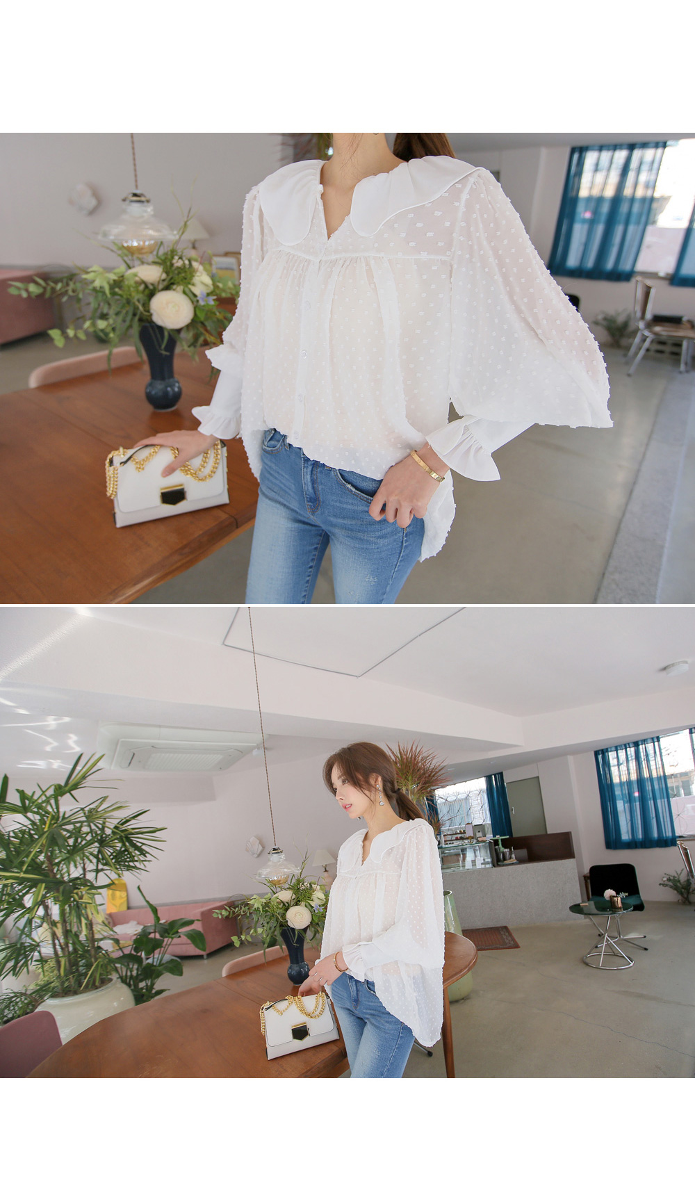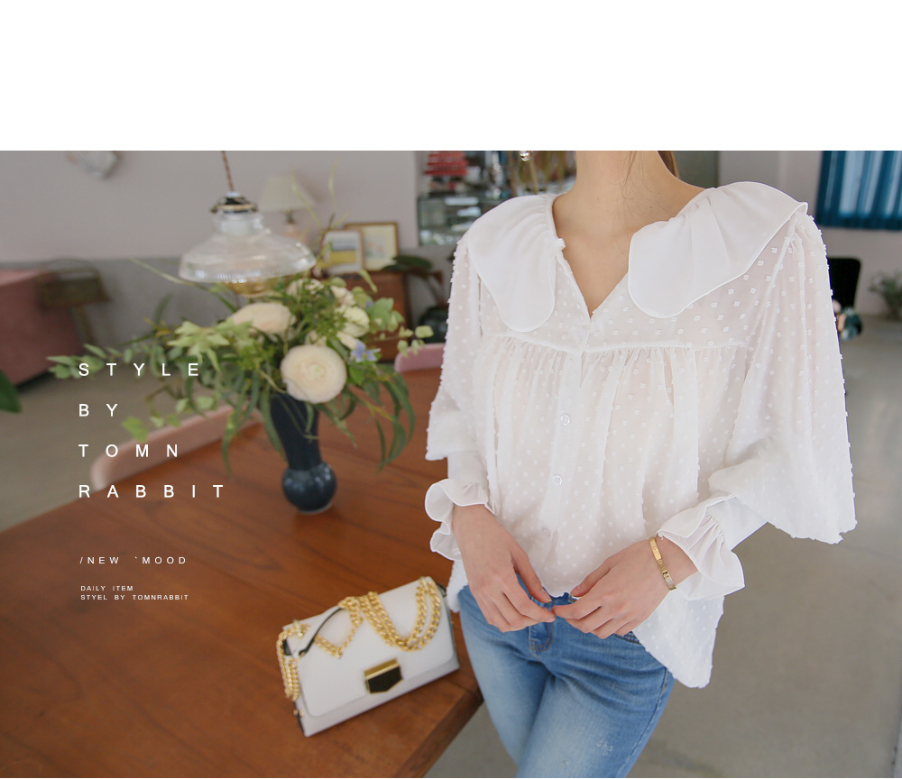 블라우스는 프릴 카라 디자인으로 여성스러운 무드를 더했으며