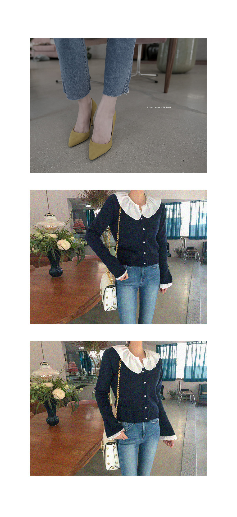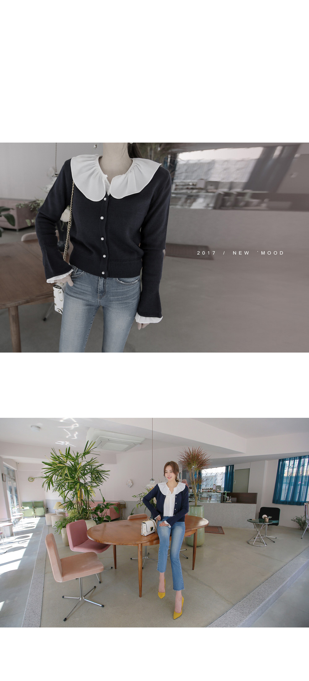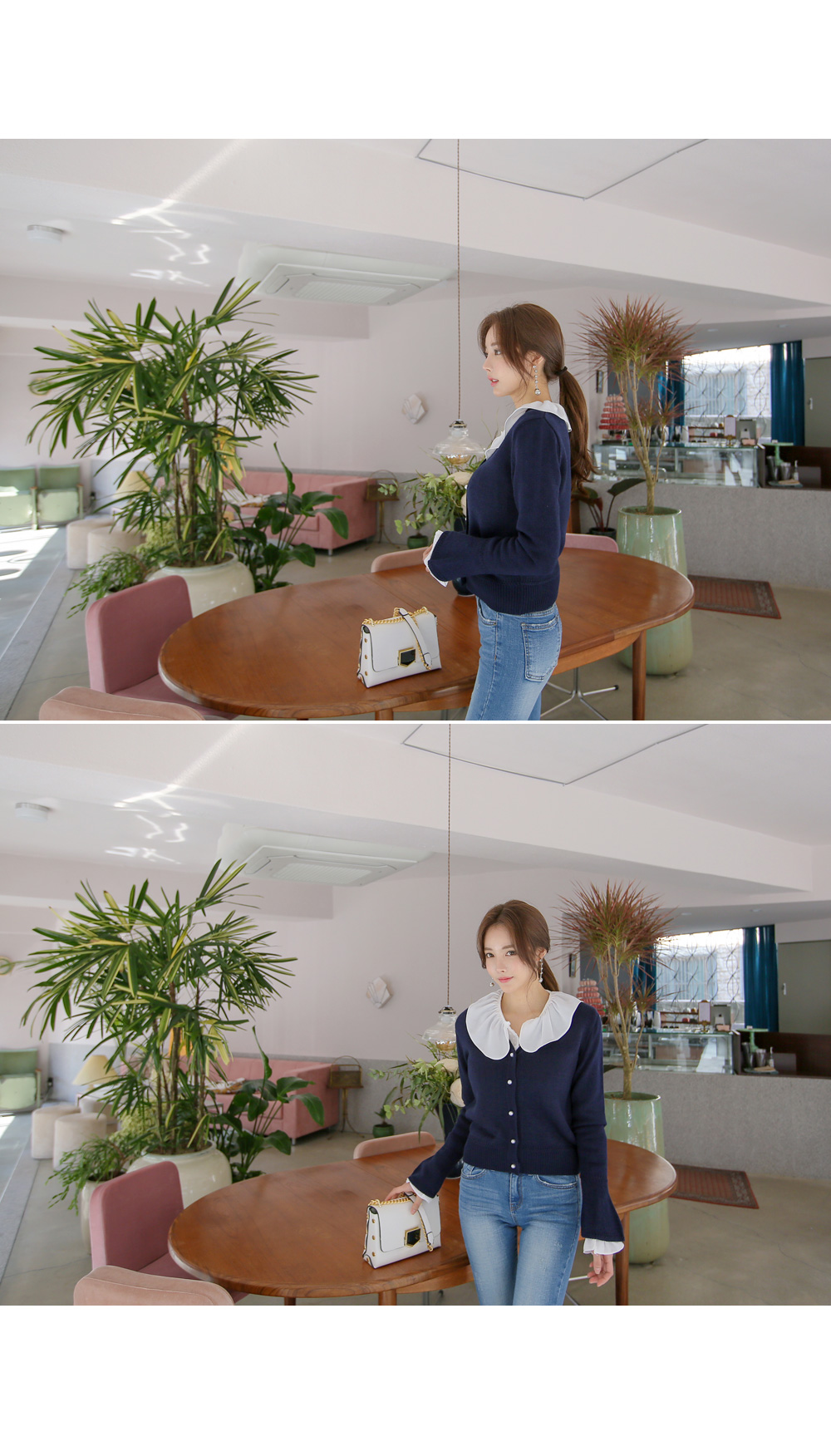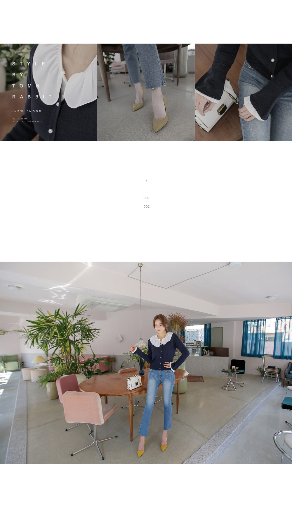 블라우스는 프릴 카라 디자인으로 여성스러운 무드를 더했으며