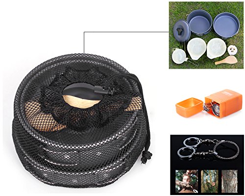 # Foldable wire saw is necessary outdoor gear and assist you to cut wood or branch quickly. headlamp and bike holder are also multifunctional that you may use them in many occasions. and mini portable stove is good pal with pot kit.