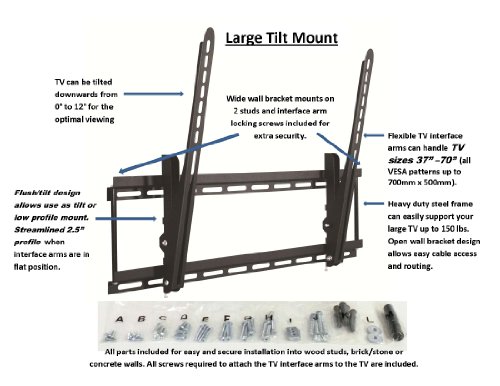 -. Binding : Electronics -. Brand : Rocelco -. Color : black -. EAN : 0693285000195 -. Feature : Flexible TV interface arms can handle TV sizes from 37-Inch - 70-Inch. Heavy duty steel frame can easily support your large TV up to 150 lbs / Universal design fits all VESA &non-VESA mounting patterns up to 700 x 500mm / Tilt continuously adjustable from 0°to 12°. Flush/Tilt design allows use as Tilt or Low Profile Mount. Mounts 2.5" from wall / All hardware included for easy and secure installation into wood studs, concrete or stone walls. All screws required to attach the TV interface arms to the TV are included / Wide wall bracket mounts on 2 studs and interface arm locking screws included for extra security. TV interface arms hook on wall bracket for easy installation -. Label : Rocelco -. Manufacturer : Rocelco -. Model : Rocelco LTM -. MPN : Rocelco LTM -. NumberOfItems : 1 -. PackageQuantity : 1 -. PartNumber : Rocelco LTM -. ProductGroup : Speakers -. ProductTypeName : AV_FURNITURE -. Publisher : Rocelco -. Studio : Rocelco -. Title : Rocelco LTM Large Tilt TV Mount for TV, Fits 37" to 70" up to 150 lbs (Black) -. UPC : 693285000195 -. Warranty : one year