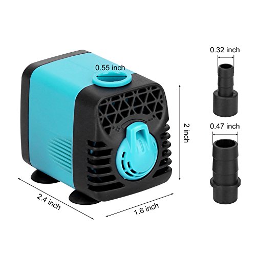 - ▷Powerful Speed Flow: 130GPH per hour, Max Lift height: up to 3-Feet, Pump Outlet inner OD: 0.55-Inch; Small Outlet Adapter OD: 0.2-Inch; Big Outlet Adapter OD: 0.39-Inch.