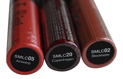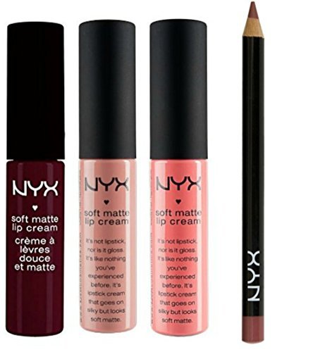 -. Binding : Misc. -. Brand : NYX -. Color : Purple -. EAN : 0769823381306 -. Feature : Nyx Soft Matte Lip Cream Set in Copenhagen SMLC20 (Matte Rich Plum), Antwerp SMLC05 (mid-yellow toned pink), Stockholm SMLCO2 (mid-toned beige) and 1 Mauve Lipliner / Matte lip cream is a new kind of lip color is in-between lipstick and gloss that is longer lasting. / Soft and Silky texture that helps keeps lips moisturized. / Lip Creams are rich in color that can be worn alone, with the liner or combined together create new color. / Lip Pencils apply smoothly and resists bleeding. -. IsAdultProduct : 0 -. MPN : 4990764 -. NumberOfItems : 4 -. PackageQuantity : 1 -. PartNumber : 4990764 -. ProductGroup : Beauty -. ProductTypeName : BEAUTY -. Title : NYX Copenhagen, Antwerp, Stockholm Lip Creams and Mauve Lip Liner Pencil (Bundle of 4) -. UPC : 769823381306