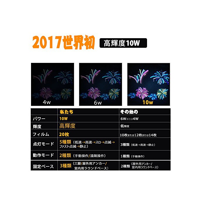 【10W업계를 리드 하는 기술】10W 보다 높은 해상 도와 밝기를 들었 led projection 라이트에,선명한 빛에 필름에 그려진 일러스트를 비춥니다.점멸 기능 신규 추가,5단계 라이트 조정:저속→고속→슬로우 점멸→퍼스트 점멸《―》정지.