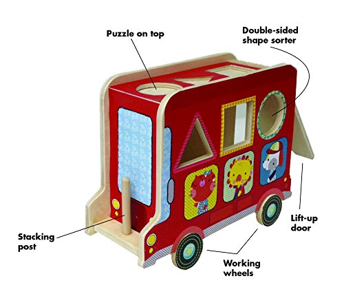 With shape sorter holes on the side, a puzzle on the top, real rolling wheels, and 8 chunky wooden play pieces, there are so many ways to play with this Earth-friendly shape-sorter toy! Next stop - fun and learning for babies and toddlers! As they fit the play pieces through the shape sorter holes, put the puzzle pieces in the shaped wells at the top, rotate the driver from one character to another, discover all the different passengers in the windows, and use the real rolling wheels to move it, kids will find endless ways to stay busy with this VERY busy bus!.Feature