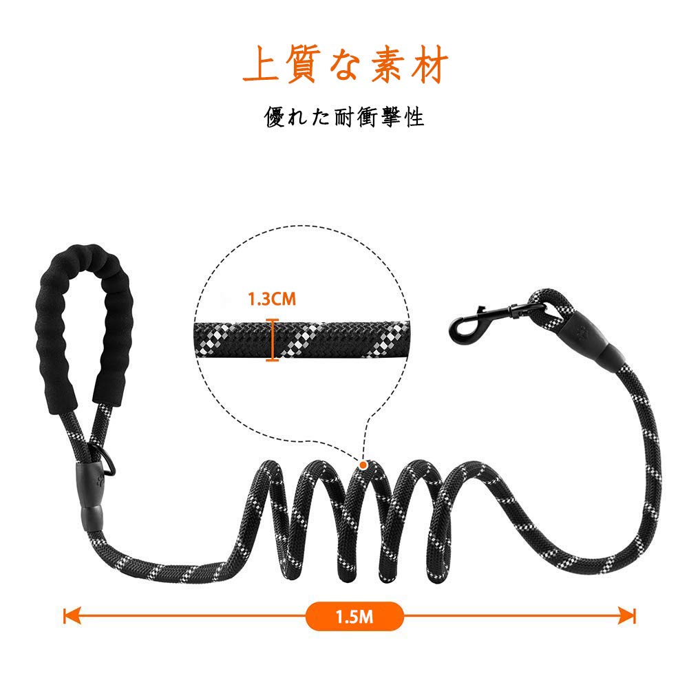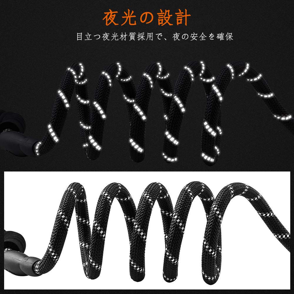 【持ちやすい】: エルゴノミクス・デザインのハンドルは、持ち手にクッションがあると快適な握り心地を提供します。 【上質な素材】: 山登り用のヒモと耐久性能が優れる ロブスターフックを使用し、優れた耐衝撃性。 【中・大型犬対応】: 長さ1.5M 荷重460kg、力の強い大型犬でも、中型犬でも適合します。 【夜光の設計】:犬のリードキラキラ、目立つ夜光材質採用で、君と犬が夜に散歩しても十分安全であることを保証する。