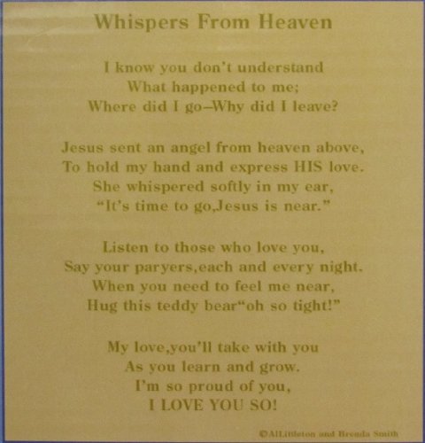 -. Binding : Misc. -. Brand : CloseoutZone -. EAN : 0891190001515 -. Feature : This special plush bear makes a unique memorial gift for children. / Bear is 8 inches holding a book that can be personalized with a picture of your loved one. / Makes a wonderful sympathy gifts for loss of child, or for children who have lost a loved one. / A unique remembrance gift for bereaved children ages 3 or older -. Label : Card It -. Manufacturer : Card It -. MPN : LYSB002OF3A24-TOYS -. PackageQuantity : 1 -. PartNumber : LYSB002OF3A24-TOYS -. ProductGroup : Toy -. ProductTypeName : TOOLS -. Publisher : Card It -. Studio : Card It -. Title : Whispers from Heaven Bear Memorial Keepsake -. UPC : 891190001515