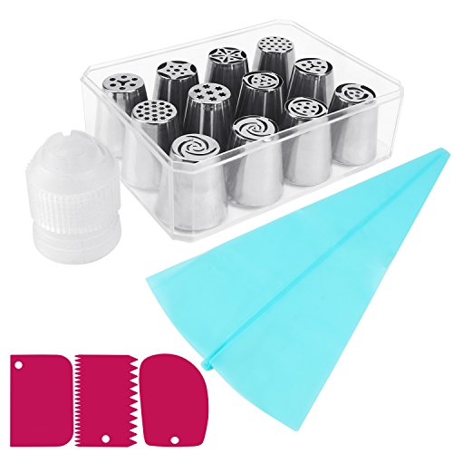 Russian Piping Tips,MCIRCO Cake Decorating Tips Set 17-piece (12 X Tips+3 X Icing Smoother + 1 X Pastry Bag + 1 X Coupler) Icing Tips Nozzels Cupcake Decorating Kits Supplies with Durabel Storage Box