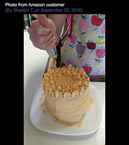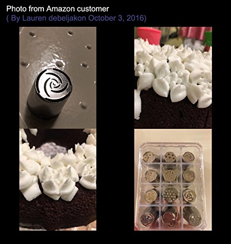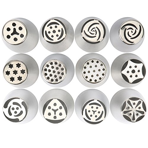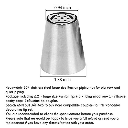 CHRISTMAS BIG SALE!!!: 12 pieces large size russian tips+ 3 pieces icing smoother+ 1 piece silicone pastry bag+ 1 piece russian tip coupler; made of heavy-duty 304 stainless steel; safe and durable; improved craft without gap inside; smooth surface makes a decent appearance; dishwaher safe,easy to clean.