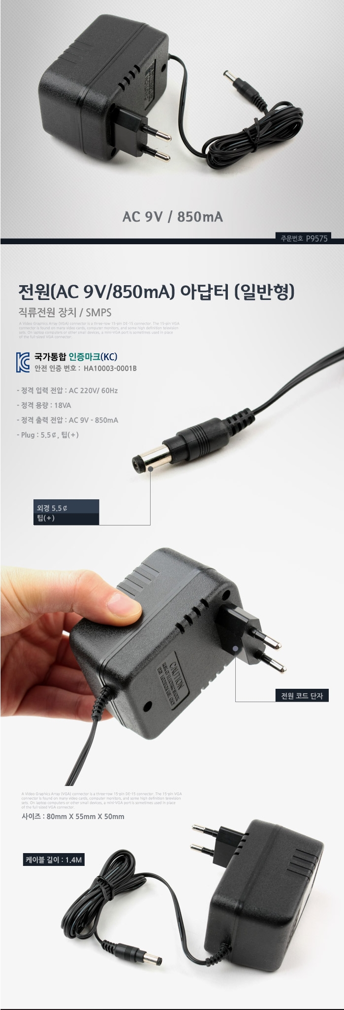 Domestic Standard Power Adapter AC 9V 850mA 5.5 ¢