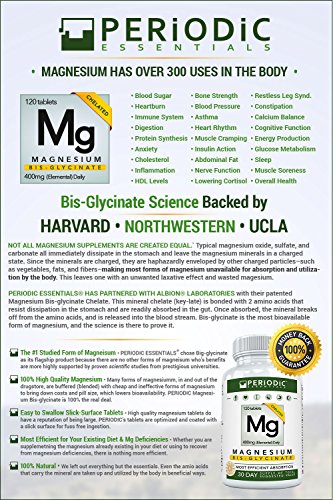 Bisglycinate is by far the Most Efficiently Absorbed Magnesium Periodic Essentials proudly utilizes Albion Minerals Magnesium Bisglycinate Chelate-a magnesium that has been fused with not 1, but 2 amino acids for maximum bio-availability (usefulness to the body). This protects against stomach acids and is easily absorbed in the gut. The bis-glycinate form insures that the full recommended daily dose of magnesium will be taken in by the body. No more wasted money, no more wasted time, no more wasted minerals.