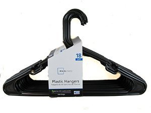 -. Binding : Kitchen -. Brand : Mainstay -. Color : Black -. Feature : Double notched to hang a variety of clothes. / Black color. / 2 packs of 18 hangers each = 36 hangers total. -. IsAutographed : 0 -. PackageQuantity : 2 -. ProductGroup : Home -. ProductTypeName : HOME -. Title : Standard Plastic Adult Hangers - Black - 18-count (2)