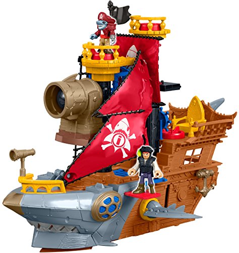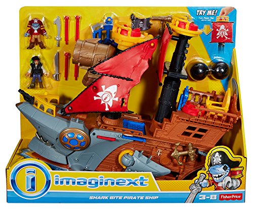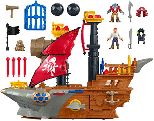 Includes Shark Bite Pirate Ship playset, 2 pirate figures, 2 helmets, 2 swords, 1 cannon ball, 4 projectiles, a spyglass and treasure