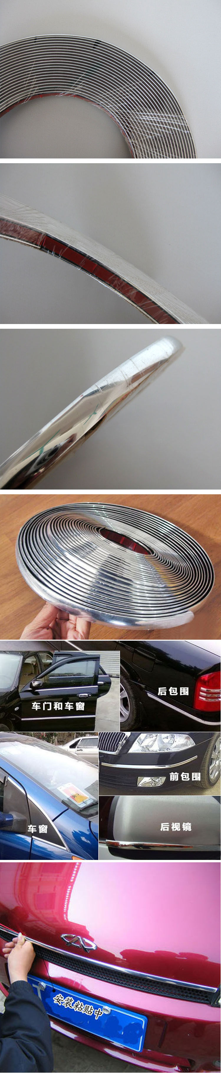 Baby Description: bright silver soft, the back with double-sided adhesive, mainly for the car's body side door, windows, surrounded by the front of the cracks at the door. Will paste the surface clean and can be posted directly after three days do not wash the car, when the curvature is relatively small, you can also slightly bend the back of the paste with double-sided adhesive.
