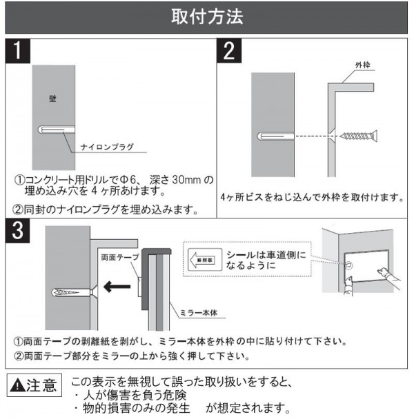 ・極端な凹凸面への設置は外枠が変形し、ミラーの脱落や画像の歪みを生じることがあります。