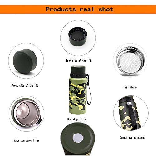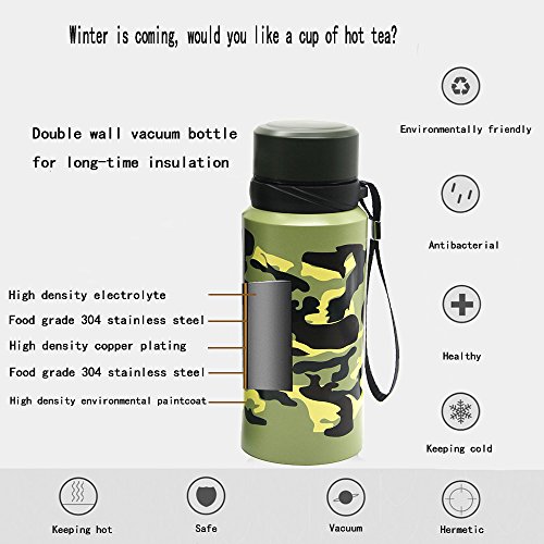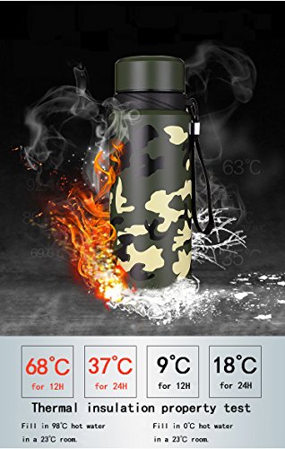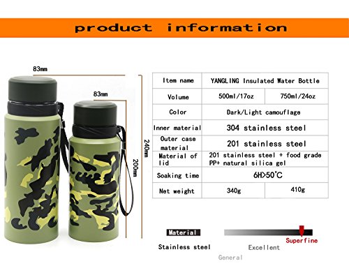 - WATER BOTTLE DEMENSION - there are 4 kinds of thermos water bottles for sale, thermos flask 750ml dark camo, thermos flask 750ml light camo, thermos flask 500ml dark camo, thermos flask 500ml light camo. Every bottle comes with a durable lanyard.