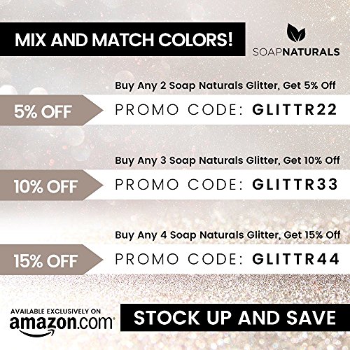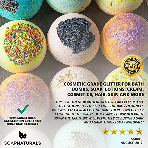 - ✅ 100% SATISFACTION GUARANTEE, 90 DAY MONEY BACK PROMISE: Soap Naturals Guarantees You Will Love Your Cosmetic Glitter or Your Money Back. Buy from Trusted Amazon Retailer, Soap Naturals. Read What Our Customers Are Saying: "We can make 500 bath bombs with one bag. Perfect Shimmer, Lovely and Fine Glitter. Makes a Statement. Finely Milled and No Scratch Whatsoever. Thanks Soap Naturals!" - Jessica H, August 2017