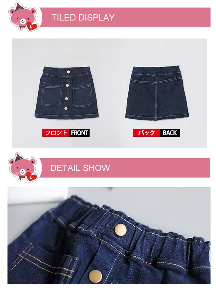 100 着丈24 ウェスト42 ヒップ56110 着丈27 ウェスト44 ヒップ60115 着丈29 ウェスト46 ヒップ64120 着丈31 ウェスト48 ヒップ66130 着丈34 ウェスト50 ヒップ70140 着丈36 ウェスト54 ヒップ74単位:cm※上記サイズは平置き実寸になります。サイズ表の実寸法は商品によって1-3cm程度の誤差がある場合がございます。