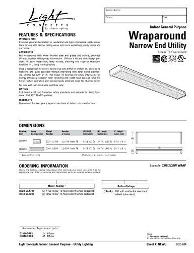 The Lithonia Lighting 2-light narrow end wraparound is ideal for use with narrow ceiling areas such as workshops, utility rooms and corridors. This utility light uses a clear, prismatic acrylic lens with white steel end plates to provide widespread illumination and features a continuous-interlocking design for easy installation, lamp access and cleaning. T8 fluorescent lamps are energy efficient, provide superior color rendering and have up to a 10,000 hour average lamp life.Feature