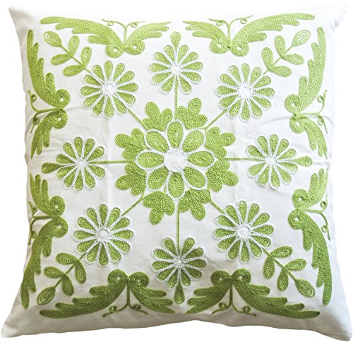 Marguerite Embroidery Decorative Throw Pillow COVER 18” Green White