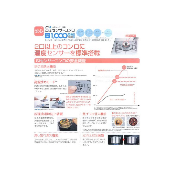 가스 소비량:강화력 버너/4.20kW(0.301kg/h)고, 강화력 버너 다랑어화/0.50kW(0.036kg/h)고, 표준 버너/2.97kW(0.213kg/h)고, 표준 버너 다랑어화/0.42kW(0.030kg/h)고, 그릴/2.00kW(0.143kg/h)고, 전점화 시/8.60kW(0.614kg/h)