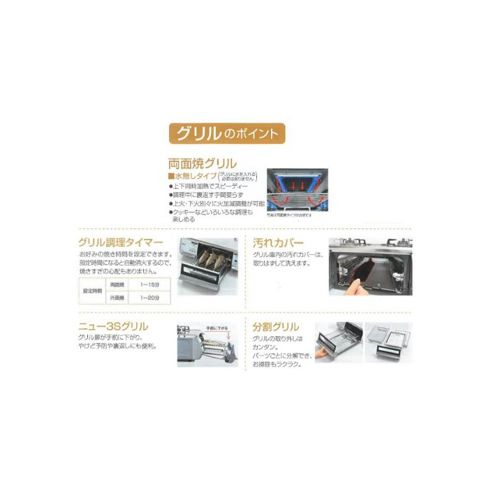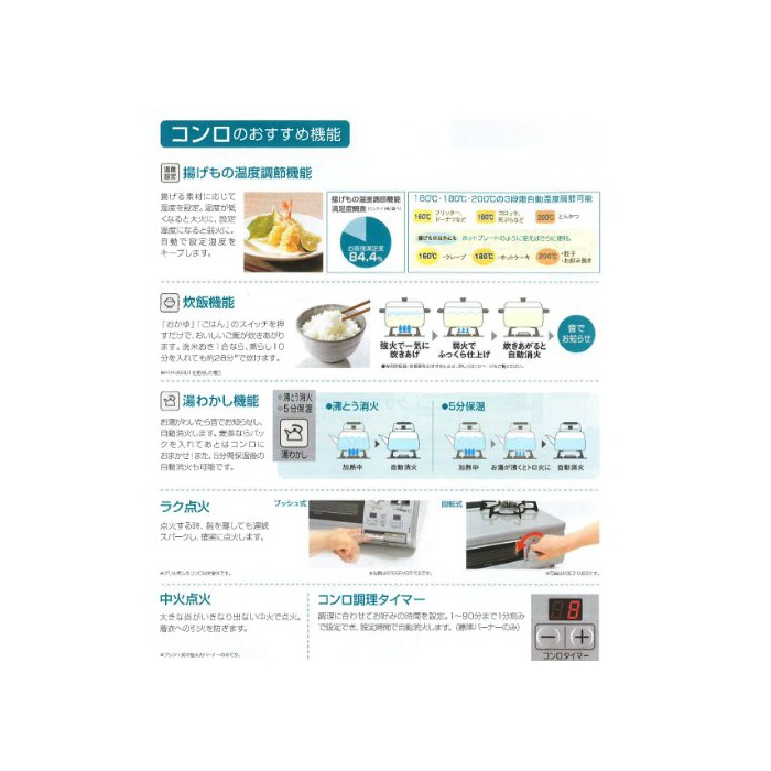 그릴망 사이즈:폭23.2×(길이)깊이30.4cm 고, 화력 조절:레버식 고, 곤로 조리 타이머:1~90분(※표준 버너 만) 고, 그릴 조리 타이머:15분