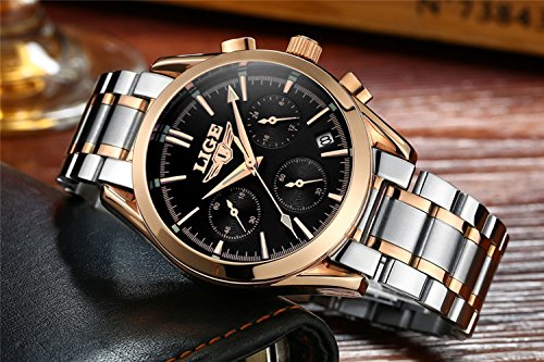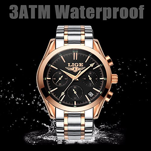-. Feature : Round watch black and gold dial with multi-function sub-dials, dress/business watch, a great gift for family or friends. / Stainless steel watchband and alloy case with Push Button Hidden Clasp, no any hurt of your clothes or hands / High quality Japanese quartz movement with analog display, provide precise time keeping. / WATERPROOF for 30M: Hand Wash, Rain Day, Sweating, NO Problem. In general, withstands splashes or brief immersion in water, but not suitable for swimming. (Please DONOT PULL OUT the button under water) / Luxury simple design watch, perfect gift with cleaning cloth for men