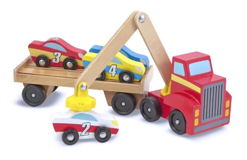 - Includes red truck with magnetic arm, car-carrier trailer, and 4 magnetic wooden cars